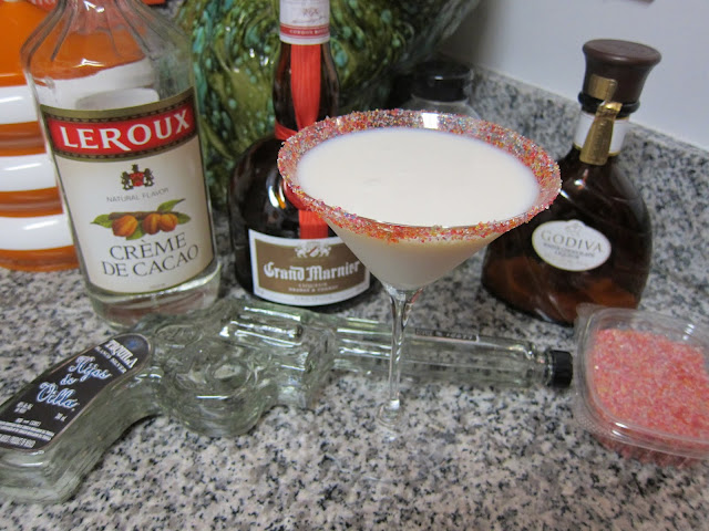 Mike’s cowboy getup inspired me to use tequila as the base spirit (and I happened to have a bottle of tequila shaped like a gun- even better!) and the white chocolate liqueur spiked with Grand Marnier go really well with it. And the extra dollop of chocolate via the creme de cacao makes it Wonka-worthy. These are very easy to drink!
